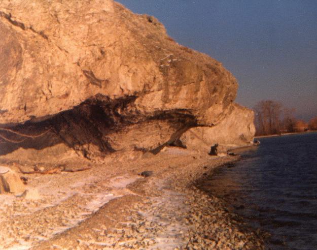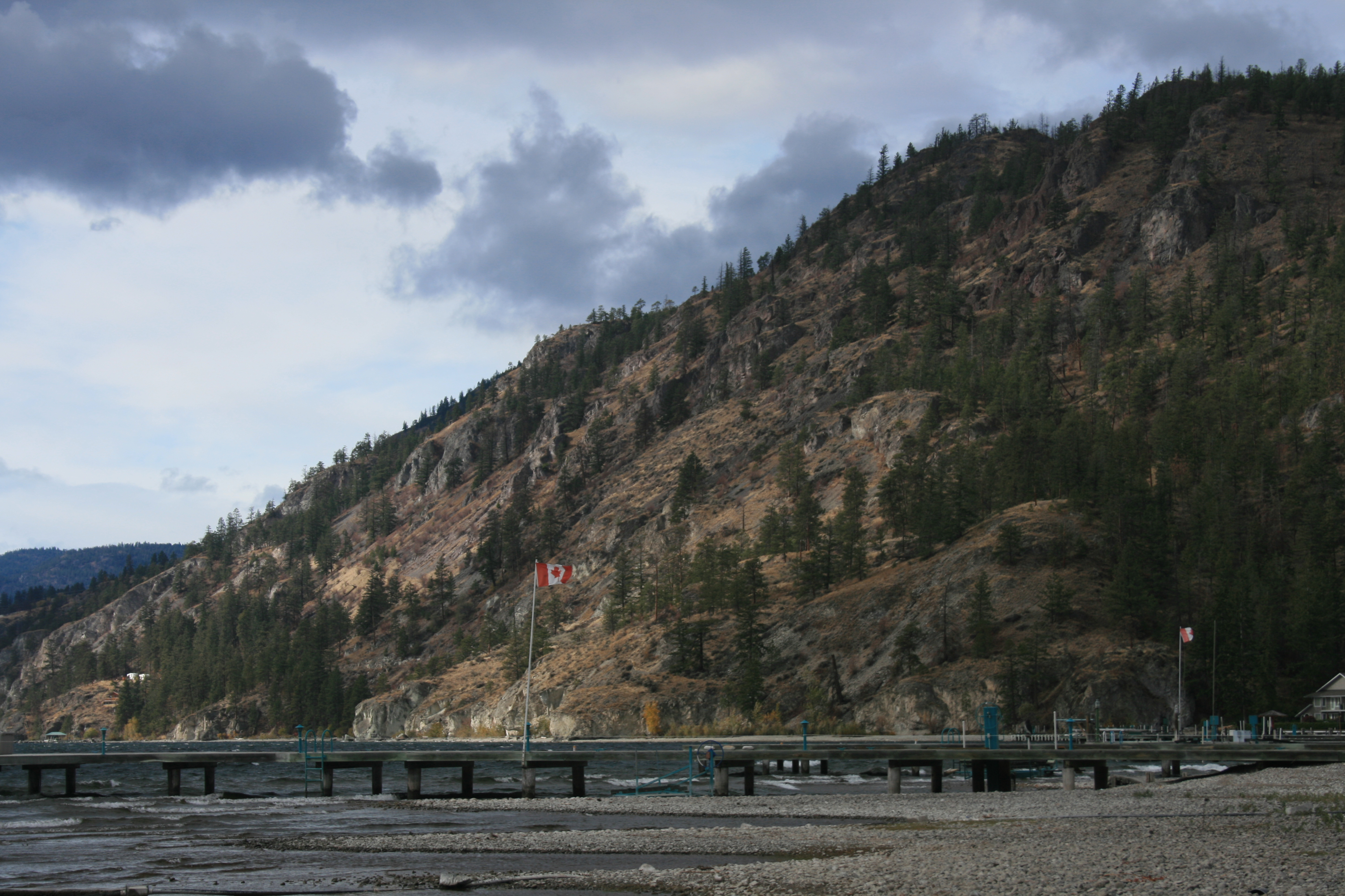 This one of the peaks on Goat's peak, named after the Gellatly Angora goats. Often they could be seen standing on the rugged rock. The green rock is Ryolite volcanic - the white rock at the beach is volcanic ash, there was an active volcano in Westbank 726,000 years ago. Then Goat's peak must also be an extinct volcano. The peak could have been used as a lookout in ancient times. Caves nearby could have provided food and shelter.