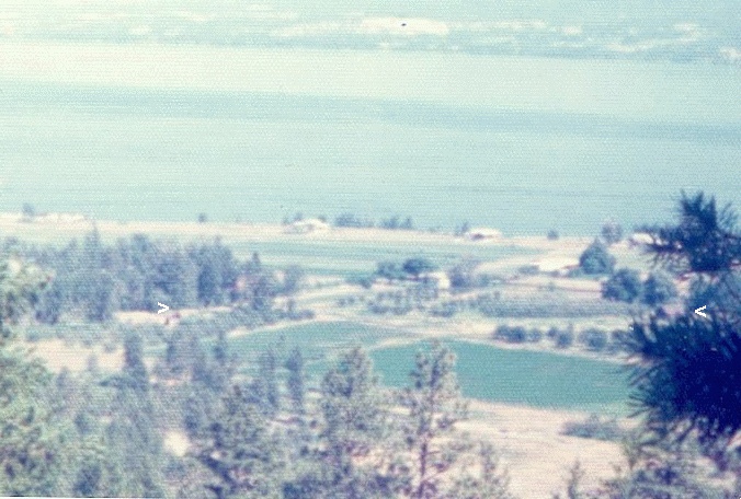 Picture of Flying Horse Farm 1975. The orchard was Pear, Cherry and Apple. ">" on the left points to the log barn now on the Gellatly Heritage Park. The "<" on the right points to the blacksmith shop. Powers Creek fed this alluvial flood plain or delta by riverlets going every direction. In spring this whole delta was flooded as riverlets went every way. The Gellatly homesteaders filled in the ravines by a horse drawn shovel. They cut down the trees and removed their stumps by dynamite. A plough, a barrel fitted with chisels and wagon wheels were still there 20 years ago.