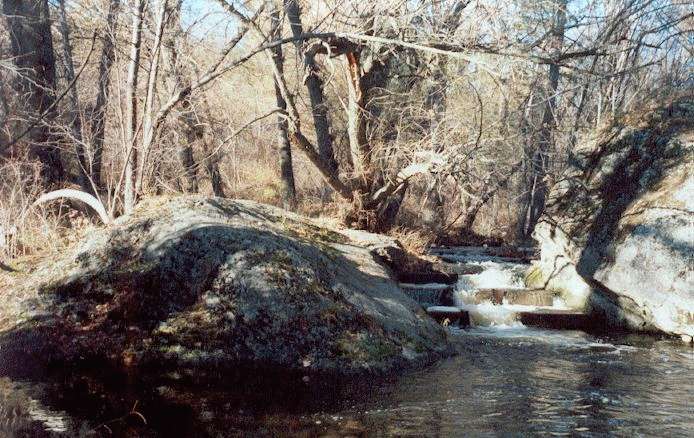 This waterfall and canyon may mark the fault line that goes up through Rose Valley. The summer of about 2002 there was a small earthquake and the horses in the pasture at Flying Horse Farm nearby could be seen running in startlement.Before this natives fished the Kokanee by daming the creek, diverting it into one of these riverlets and scooping up the stranded fish on the now dry creek bed. As a boy I remember greeting natives at the bridge below our house. A pole with a nail at the tip was curved to snag the fish. A fish ladder was installed at the falls on Powers creek in 1980. Originally the creek ran around the rock instead of over.