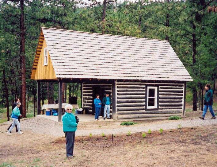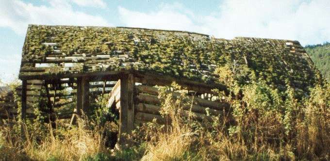Picture taken 2000. Log cabin built by Billy Powers 1888. The natives did not accept him and tried to scare him off because Powers flat, the delta, was their hunding ground. He used lanterns to ward them off. He abandoned the cabin 1889. The property was purchased by David Erskine Gellatly in 1900. The cabin was the home of the Gellatly family until 1908 and housed the Post Office from 1903 - 1908 when it was moved to the Gellatly's new home. 1993 - side 1993 - end