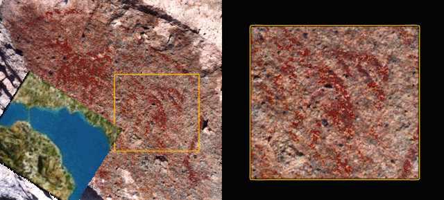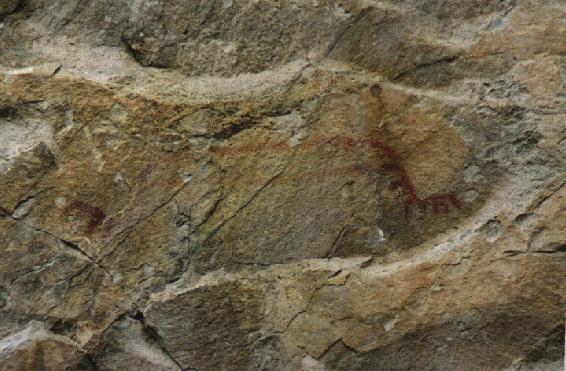 Eagle diving at ducks and scops in Gellatly Bay, October 2003. You can see the bend in the eagle's wings is very like this pictograph of the Thunderbird. The Thunderbird is very like the Phoenix, the reborn Sun rising from the ashes of the old Sun. Eagles often fly from Gellatly Bay over Powers Creek and over this pictograph on their way to Peachland.