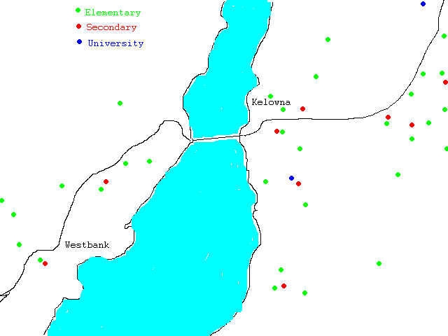 Rosevalley Elementary Lakeview Elementary Hudson Road Elementary Mount Boucherie Secondary Chief Tomat Elementary Helen Gorman Elementary Glenrosa Elementary Webber Road Elementary Westbank Elementary George Pringle Secondary Okanagan University College Kelowna Senior Secondary Central Elementary A.S. Matheson Elementary Raymer Elementary KLO Secondary Casorso Elementary Anne McClymont Elementary Okanagan Mission Elementary and Secondary Bellevu Elementary Dorothea Walker Elementary Okanagan University College Ellison Elementary Rutland Middle School Rutland Elementary Pearson Elementary Bankhead Elementary Dr Knox Middle School