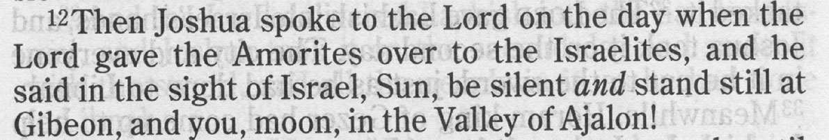 여호수아 10:12 여호와께서 아모리 사람을 이스라엘 자손 앞에 붙이신 날에 여호수아가 여호와께 고하여 이르되 이스라엘 목전에서 너는 기브온 위에 해가 머물러 있고 너는 아살론 위에 달하라