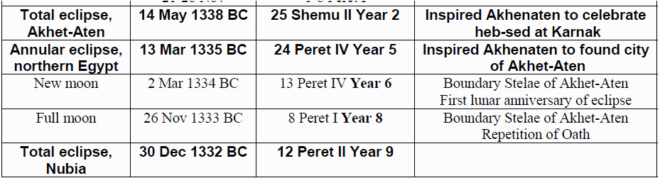 Below you will see two anchor dates, II Shemu 25, May 14, 1338 BC and IV Peret 12, December 30, 1332 BC. Every 19 years the lunar date will match the fixed Egyptian date. So add 76 years to May 14, 1338 BC and we have the solar eclipse June 14, 1414 BC = II Shemu 25. Likewise add 76 years to December 30, 1332 BC and we have the solar eclipse January 29, 1407 BC = IV Peret 12. Merneptah died a few months short of a full ten year reign beginning in July or June. His death could be in April.