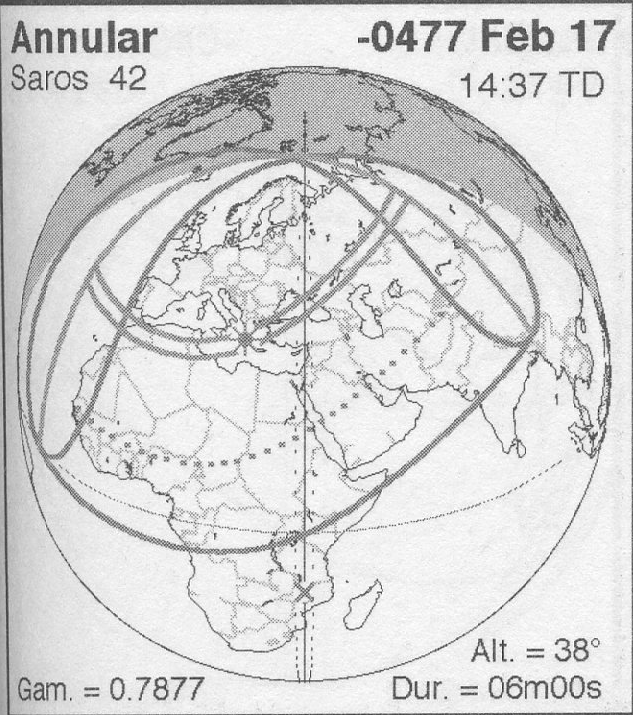 Here you see a total solar eclipse at this exact location at exactly noon February 17, 478 BC (There is no zero BC thus 477 BC is really 478 BC). Then these dates and the chronology must be correct.